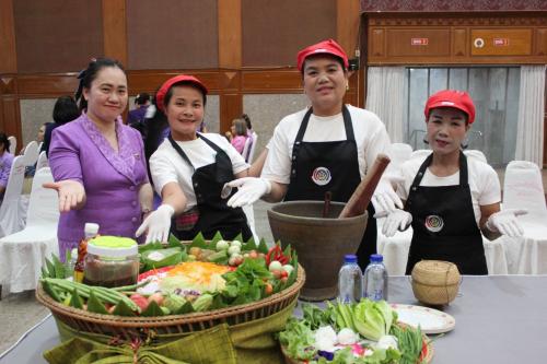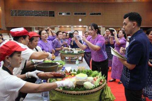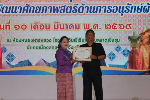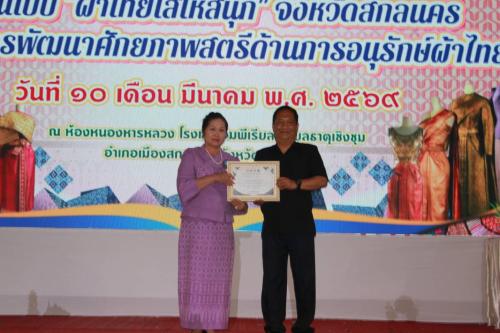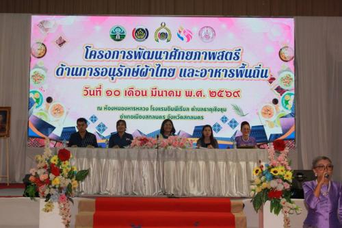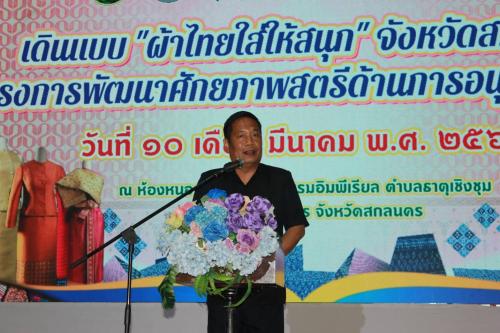นายวีรรัตน์ ธีรมิตร รองผู้ว่าราชการจังหวัดสกลนคร เป็นประธานในพิธีเปิดโครงการพัฒนาศักยภาพสตรี ด้านการอนุรักษ์ผ้าไทย และอาหารพื้นถิ่น โดยมีนางอำนวย ยุทธคราม ประธานคณะกรรมการพัฒนาสตรีจังหวัดสกลนคร กล่าวรายงานวัตถุประสงค์ของโครงการ เพื่อเสริมสร้างศักยภาพสตรี และส่งเสริมการอนุรักษ์ชุดไทยพระราชนิยม ตลอดจนสืบสานภูมิปัญญาท้องถิ่นด้านผ้าไทยและอาหารพื้นถิ่นของจังหวัดสกลนคร